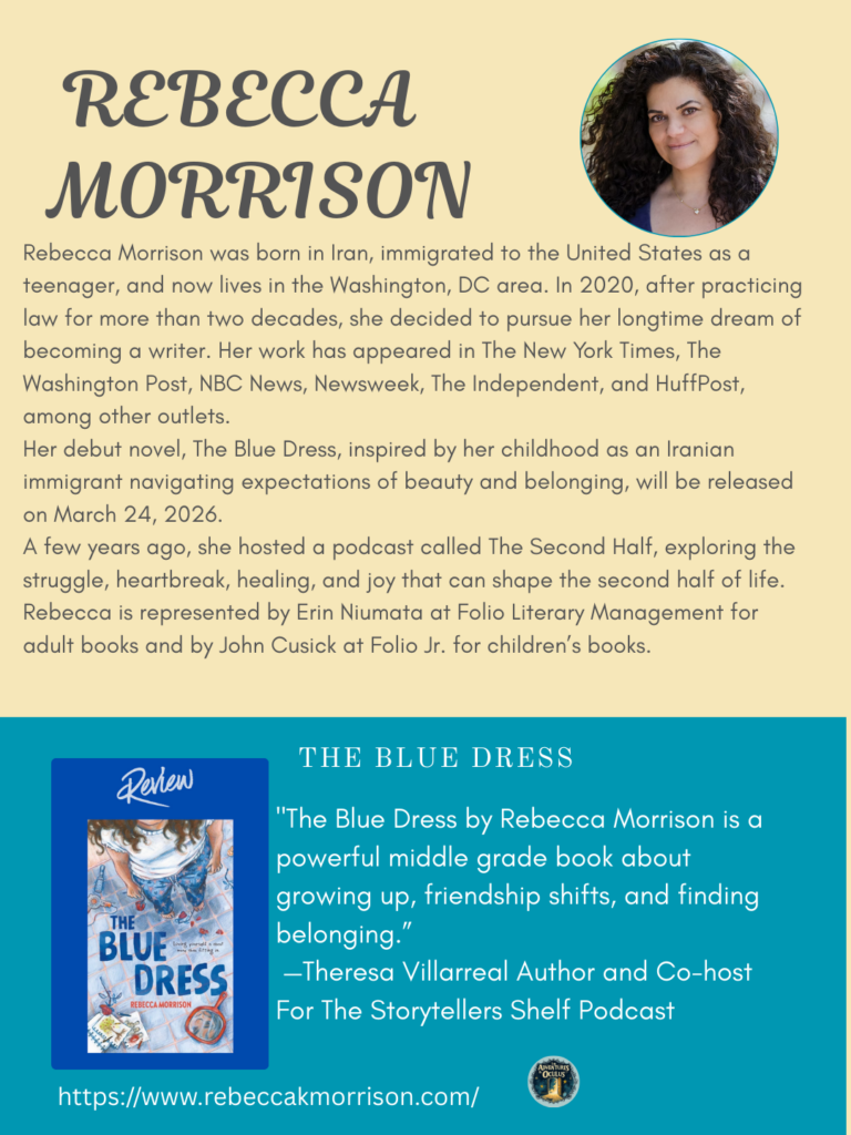 The Blue Dress by Rebecca Morrison is the kind of middle grade novel that does not need to be loud to be powerful. It takes place in Ashbury Falls and follows Yasmin at the beginning of the teen years, that in between stage where you are still a kid, but you are expected to handle emotions and expectations that feel much bigger than you. Morrison captures that age with a steady hand. The school world feels familiar in the most honest way, the social rules, the constant self awareness, the way one comment can echo in your head long after it was said.